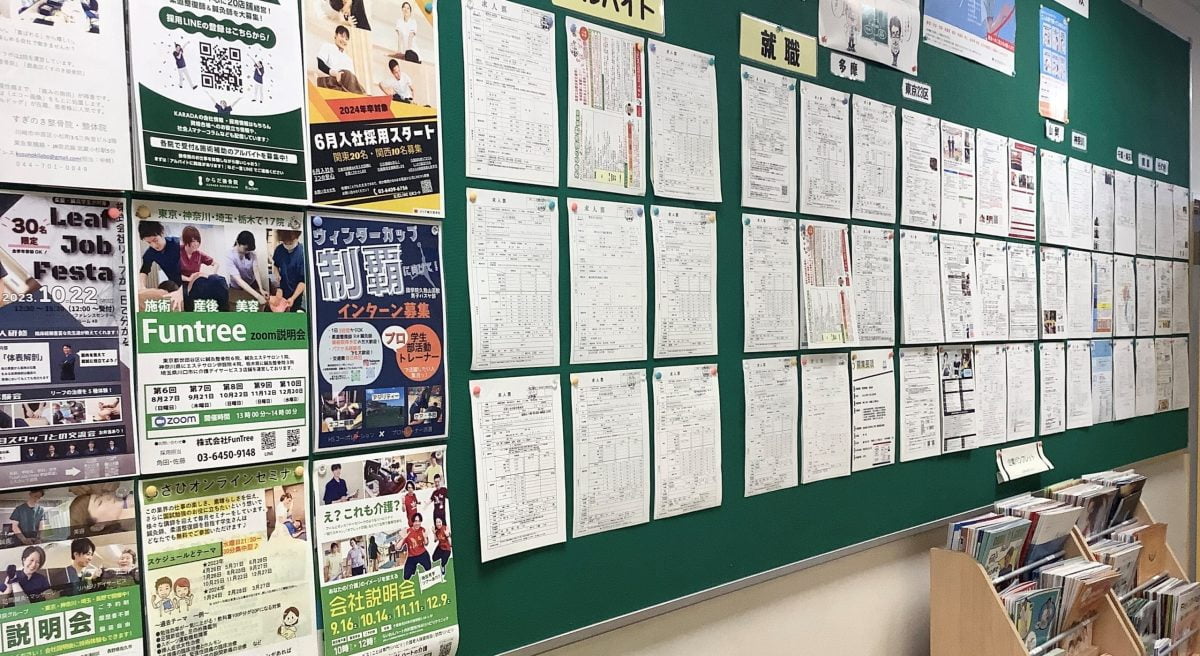 在校生・卒業生には学内の求人票掲示板のみならず、関東柔道整復専門学校のホームページからも求人票を見られるようなシステムを構築し、いつでも、どこにいても、気になったときに求人票を閲覧できるような環境を整えております。