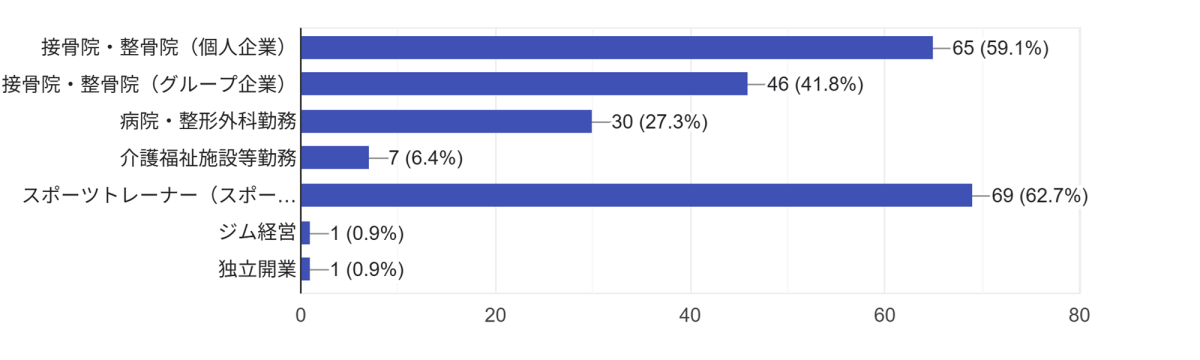 下のグラフは、「将来、どんな職場で仕事をしたいですか?」という問いに対しての回答です。関東柔道整復専門学校に入学した62.7%の学生が、スポーツトレーナーの仕事をしたいという回答をし、59.1%での2位には、個人企業の接骨院、整骨院での勤務を希望しているようです。3位は、グループ企業の接骨院、整骨院での勤務で41.8%。そして、病院、整形外科での勤務が27.3%と続きます。少し前までは、ダントツの1位であった「独立開業」が、近年では0.9%と、独立開業を考えて、関東柔道整復専門学校に入学し、柔道整復師の国家資格取得を目指しているわけではないという傾向になっています。