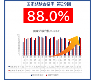 「第29回柔道整復師国家試験 88.0%」近年、国家試験の合格率に苦労した年もありましたが、昨年度は88.0%まで回復してきました。これは「学生達の努力」と「学生たちの絶対に合格する!という気持ち」の結果ではありますが、その陰で、本校教員陣の実践してきた国家試験対策と熱意が実りつつあるものだと自負しております。本校ではあくまでも「全員合格」「合格率100%」に拘って今後も国家試験に挑んでいきますが、万が一、国家試験に現役合格できなかった卒業生に対し、講義や国家試験対策講座を履修できる無償の「合格保証制度」を設け、チャレンジクラスとして担当教員を就け徹底してサポートします。